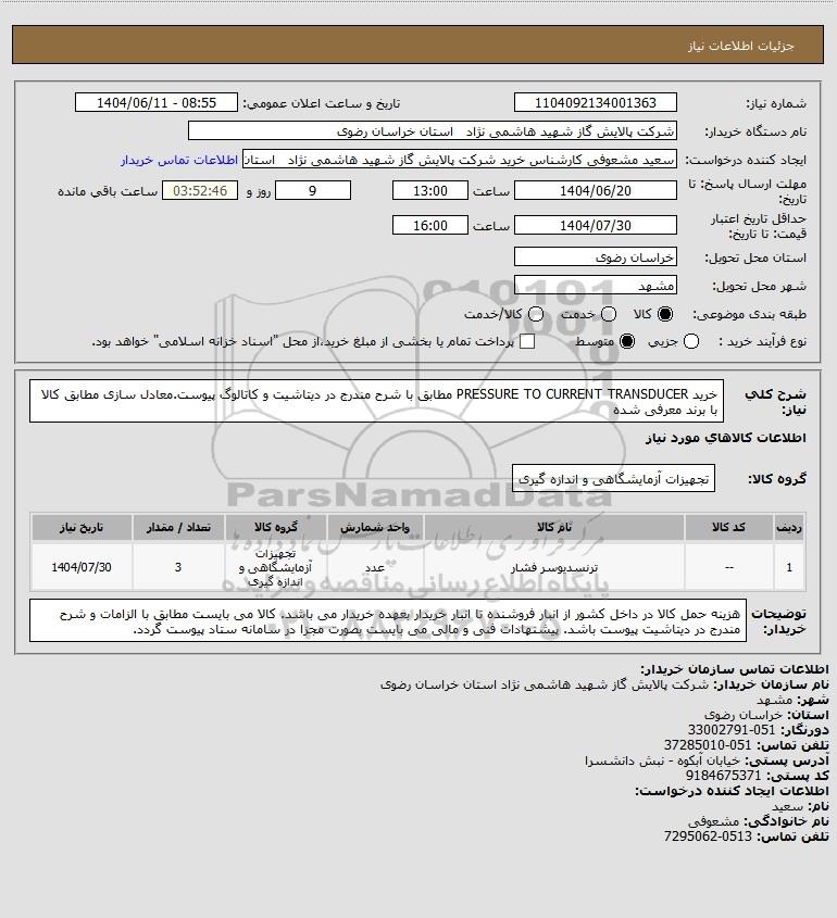نام دستگاه خریدار:شرکت پالایش گاز شهید هاشمی نژاد استان خراسان رضوی