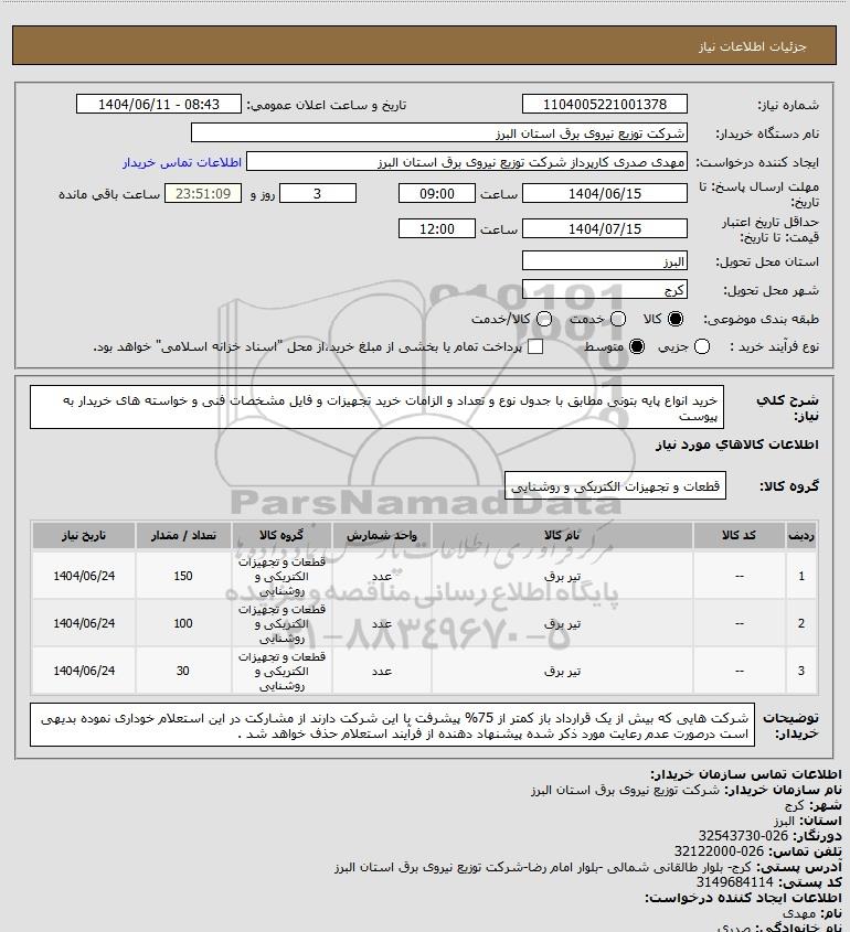 | 3 | -- | تیر برق | عدد | قطعات و تجهیزات الکتریکی و روشنایی | 30 | 1404/06/24 |
