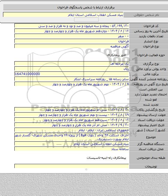 مناقصه اجرای اسکلت ۴۸ واحد ( بلوک AوB ) از پروژه ۶۸ واحدی مسکن شهری- گلسار شهر ایلام بصورت دستمزدی از کلیه افراد متخصص و شرکت‌ها واجد شرایط دعوت به عمل می‌آید در مناقصه با کد خبرگزاری پارس نماد: 9486753 شرکت نمایند. این مناقصه در تاریخ 1404/06/11 شروع و مهلت آن تا تاریخ 1404/06/13 میباشد.