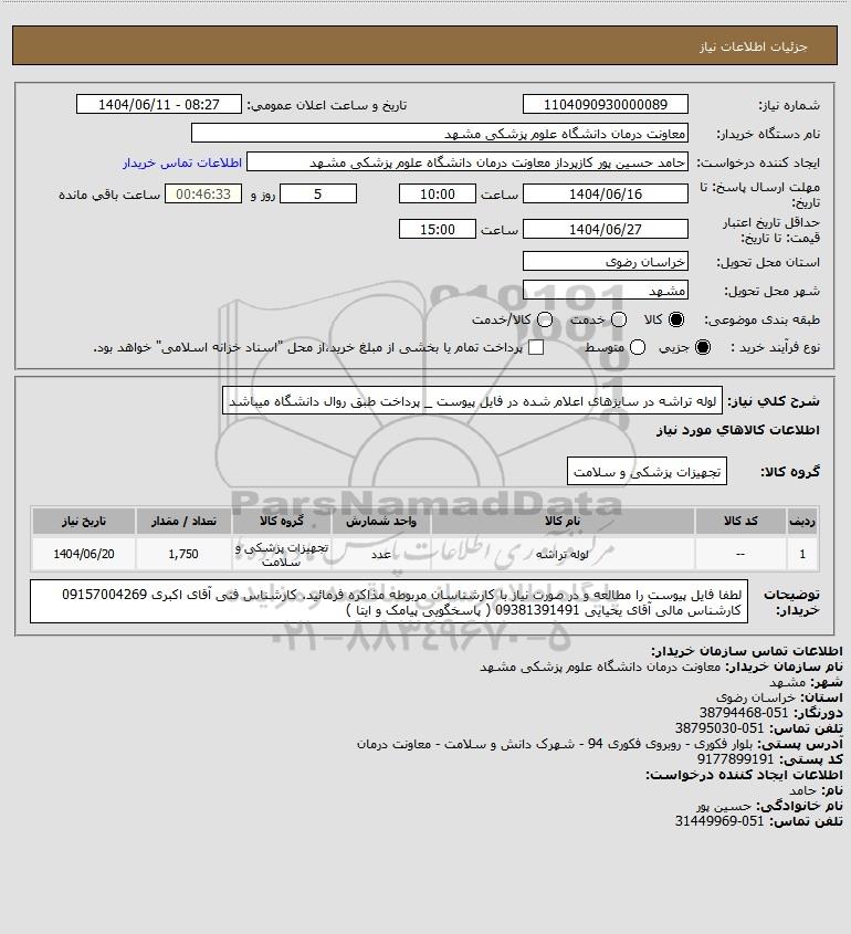 استعلام لوله تراشه در سایزهای اعلام شده در فایل پیوست _ پرداخت طبق روال دانشگاه میباشد, استعلام لوله تراشه در سایزهای اعلام شده در فایل پیوست _ پرداخت طبق روال دانشگاه میباشد