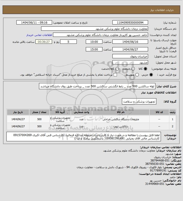 شرح کلی نیاز: لوله ساکشن 500 عدد _ رابط انگشتی ساکشن 500 عدد _ پرداخت طبق روال دانشگاه میباشد