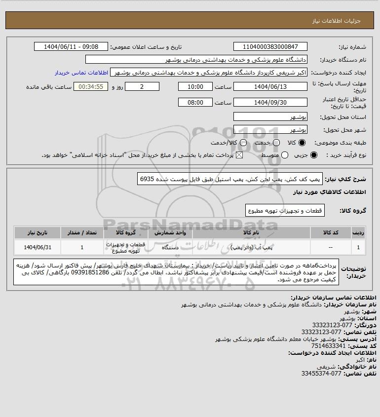 شرح کلی نیاز: پمپ کف کش، پمپ لجن کش، پمپ استیل طبق فایل پیوست شده 6935