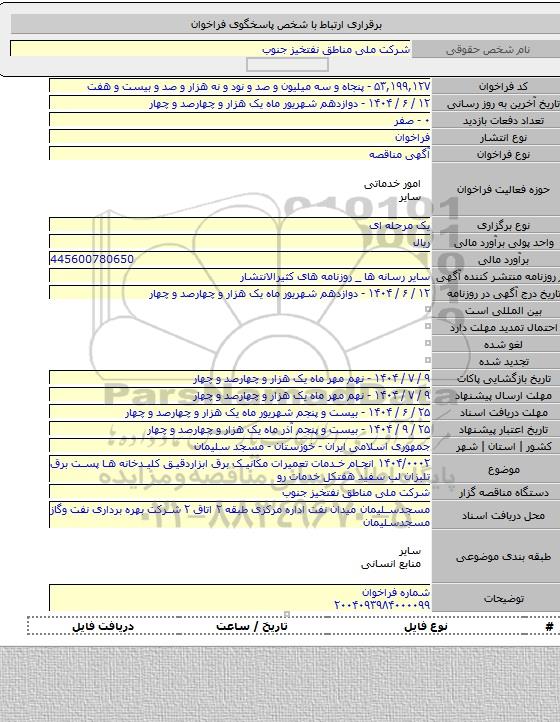 مناقصه ۱۴۰۴/۰۰۰۲ انجام خدمات تعمیرات مکانیک برق ابزاردقیق کلیدخانه ها پست برق تلبزان لب سفید هفتکل خدمات رو از کلیه افراد متخصص و شرکتها واجد شرایط دعوت به عمل میآید در مناقصه با کد خبرگزاری پارس نماد: 9487223 شرکت نمایند.