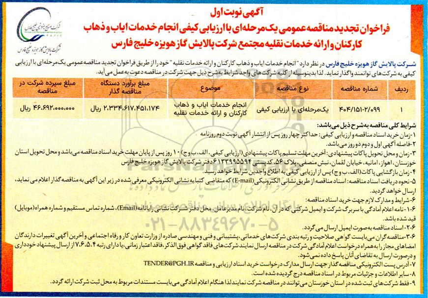 شرکت پالایش گاز هویزه خلیج فارس در نظر دارد انجام خدمات ایاب و ذهاب کارکنان و ارائه خدمات نقلیه خود را از طریق فراخوان تجدید مناقصه عمومی یک مرحله ای با ارزیابی کیفی به شرکتهای توانمند واگذار نماید. لذا بدینوسیله از کلیه شرکتهای واجد شرایط به شرح ذیل جهت شرکت در مناقصه دعوت به عمل می آید.