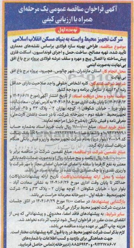 موضوع مناقصه: طراحی، بهینه سازه فولادی بر اساس نقشه های معماری تأیید شده تهیه مصالح ساخت حمل و اجرای فونداسیون اسکلت فلزی پیش ساخته با اتصال پیچ و مهره و سقف عرشه فولادی پروژه برج باغ افق بی نهایت به صورت آیتمی