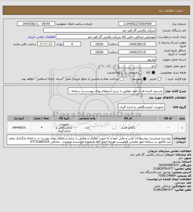| 1 | -- | رگلاتور فشار | عدد | تجهیزات آزمایشگاهی و اندازه گیری | 4 | 1404/06/31 |