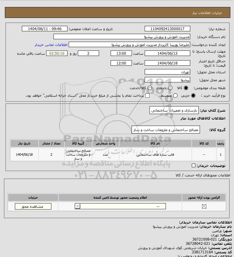 نام دستگاه خریدار:مدیریت اموزش و پرورش پیشوا