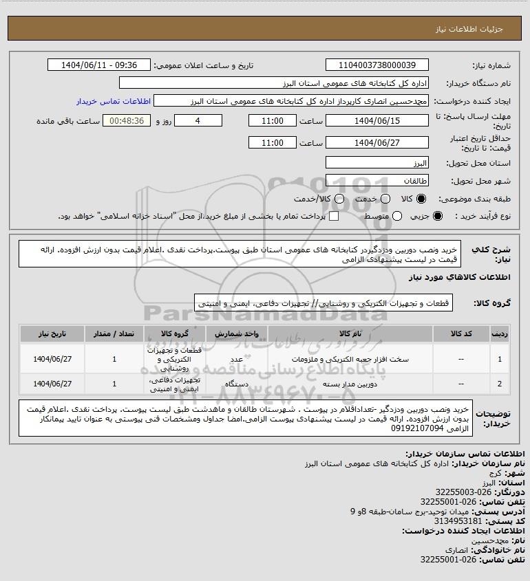 استعلام بها و موضوع استعلام استعلام خرید ونصب دوربین ودزدگیردر کتابخانه های عمومی استان طبق پیوست.پرداخت نقدی .اعلام قیمت بدون ارزش افزوده. ارائه قیمت در لیست پیشنهادی الزامی به اطلاع کلیه شرکت‌ها و افراد متخصص واجد شرایط می‌رساند، آگهی گذار در نظر دارد از طریق استعلام بها، نسبت به انتخاب و دریافت پیشنهادات اقدام نماید. این استعلام با کد آگهی ثبت شده در سامانه خبرگزاری پارس نماد : 9487858 منتشر شده است. مشخصات استعلام : تاریخ شروع استعلام: 1404/06/11 آخرین مهلت ارسال پیشنهاد قیمت : 1404/06/15 و محل اجرای پروژه : استان البرز میباشد. استعلام قیمت مورد درخواست : استعلام خرید ونصب دوربین ودزدگیردر کتابخانه های عمومی استان طبق پیوست.پرداخت نقدی .اعلام قیمت بدون ارزش افزوده. ارائه قیمت در لیست پیشنهادی الزامی با دسته‌بندی‌های تخصصی و گروه های مرتبط : انواع تابلو و راکهای مخابراتی و برقی, سیستم های حفاظتی-دوربین مدار بسته،دزدگیر،آیفون تصویری و آنتن مرکزی, تجهیزات برق و الکترونیک, استعلام اطلاع رسانی میگردد. شرایط شرکت در استعلام آنلاین : ابتدا ثبت نام در سامانه استعلام پارس نماد و تکمیل مدارک موردنیاز و بارگذاری در سامانه رعایت تمامی ضوابط و الزامات مندرج در اسناد استعلام است.