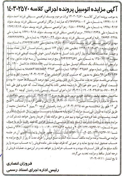 مزایده فروش یکدستگاه سواری دنا مدل 1400 رنگ سفید روغنی به مبلغ 9.200.000.000 ریال