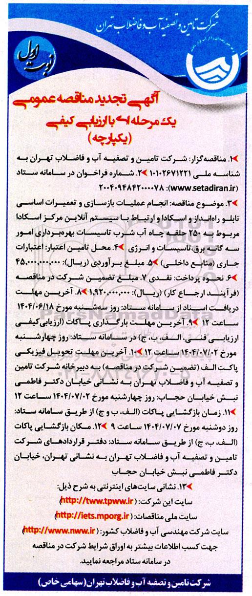 1- مناقصه گزار: شرکت تامین و تصفیه آب و فاضلاب تهران به شناسه ملی 10102671221