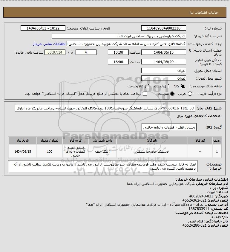 شرح کلی نیاز: تایر PN:650X16 TIRE باکارشناس هماهنگ شود-تعداد:100 عدد-کالای انتخابی جهت تشابه- پرداخت مالی:2 ماه اداری