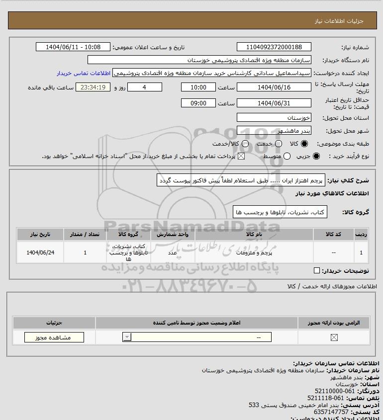 شرح کلی نیاز: پرچم اهتزاز ایران ..... طبق استعلام لطفاً پیش فاکتور پیوست گردد