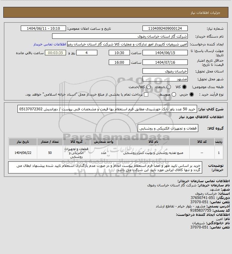 شرح کلی نیاز: خرید 50 عدد پاور بانک خورشیدی مطابق فرم استعلام بها قیمت و مشخصات فنی پیوست / دوراندیش 05137072302