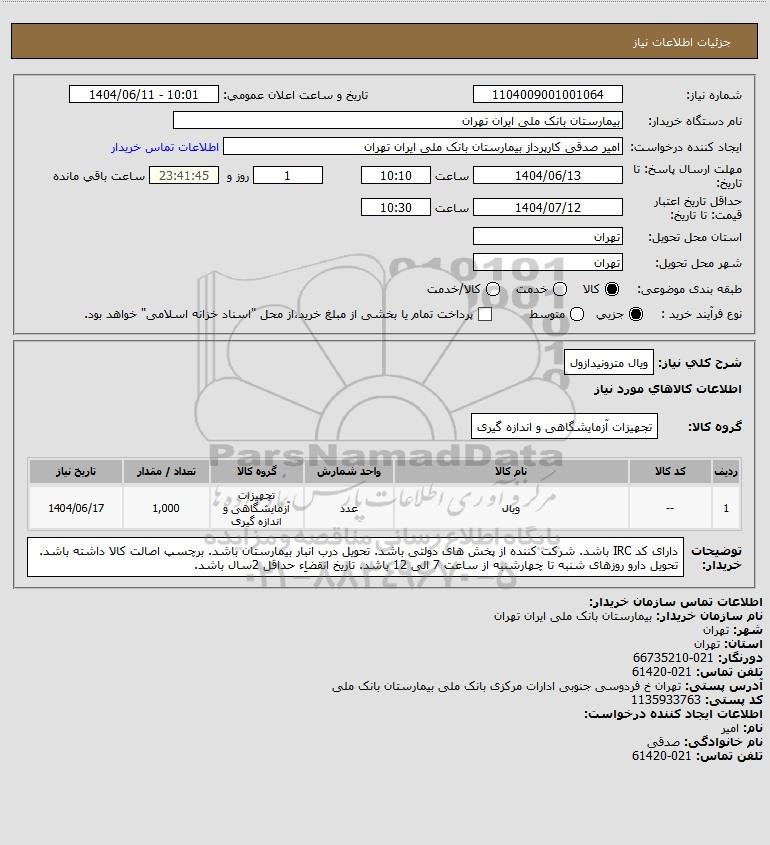 | 1 | -- | ویال | عدد | تجهیزات آزمایشگاهی و اندازه گیری | 1,000 | 1404/06/17 |