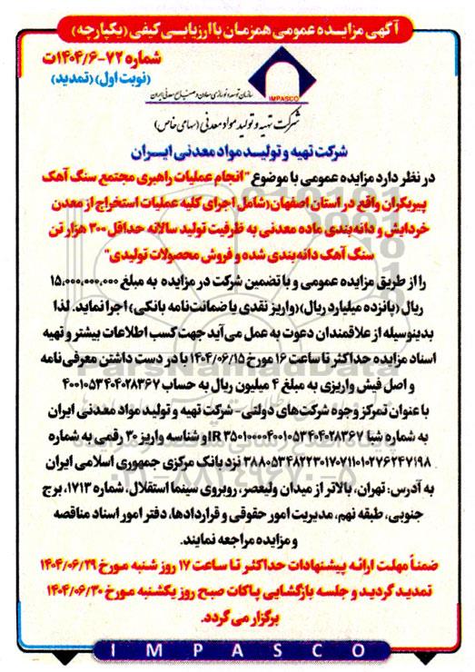 شرکت تهیه و تولید مواد معدنی ایران در نظر دارد مزایده عمومی با موضوع "انجام عملیات راهبری مجتمع سنگ آهک پیربکران واقع در استان اصفهان (شامل اجرای کلیه عملیات استخراج از معدن، خردایش و دانه بندی ماده معدنی به ظرفیت تولید سالانه حداقل 300 هزار تن سنگ آهک دانه بندی شده و فروش محصولات تولیدی " را از طریق مزایده عمومی و با تضمین شرکت در مزایده به مبلغ 15.000.000.000 ریال (پانزده میلیارد ریال) (واریز نقدی یا ضمانت نامه بانکی) اجرا نماید؛ لذا بدینوسیله از علاقه مندان دعوت به عمل می آید جهت کسب اطلاعات بیشتر و تهیه اسناد مزایده حداکثر تا ساعت 16 مورخ 1404.06.15 با در دست داشتن معرفی نامه و اصل فیش واریزی به مبلغ 4ر میلیون ریال به حساب 4001053404028367 با عنوان تمرکز وجوه شرکتهای دولتی شرکت تهیه و تولید مواد معدنی ایران به شماره شبا 350100004001053404028367 IR و شناسه واریز 30 رقمی به شماره 388053482230170711010276247198 نزد بانک مرکزی جمهوری اسلامی ایران به آدرس: تهران، بالاتر از میدان ولیعصر، روبه روی سینما استقلال، شماره 1713 ، برج جنوبی، طبقه نهم ، مدیریت امور حقوقی و قراردادها دفتر امور اسناد مناقصه و مزایده مراجعه نمایند.
