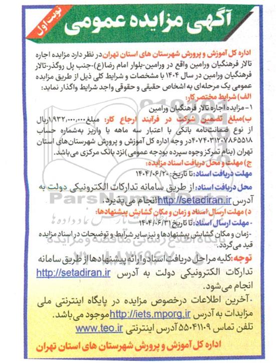 اداره کل آموزش و پرورش شهرستان های استان تهران در نظر دارد مزایده اجاره تالار فرهنگیان ورامین واقع در ورامین - بلوار امام رضا (ع) - جنب پل روگذر - تالار فرهنگیان ورامین در سال 1404 با مشخصات و شرایط کلی ذیل از طریق مزایده عمومی یک مرحله ای به اشخاص حقیقی و حقوقی واجد شرایط واگذار نماید