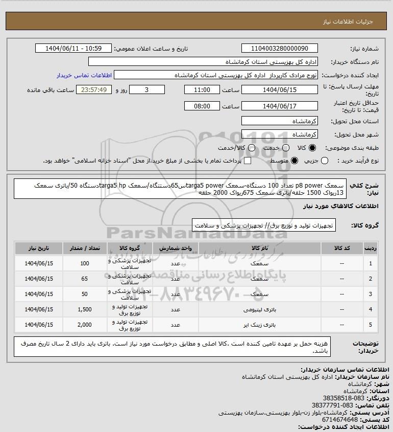 شرح کلی نیاز: سمعک p8 power تعداد 100 دستگاه-سمعک targa5 powerس65دستتگاه/سمعک targa5 hpدستگاه 50/باتری سمعک 13ریواک 1500 حلقه/باتری سمعک 675ریواک 2000 حلقه