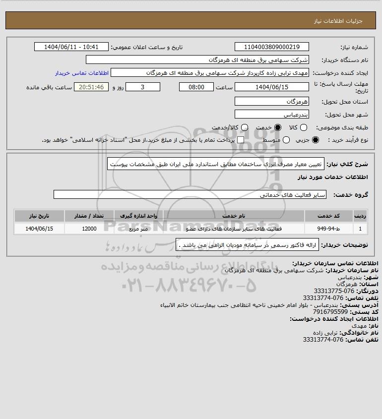 شرح کلی نیاز: تعیین معیار مصرف انرزی ساختمان مطابق استاندارد ملی ایران طبق مشخصات پیوست