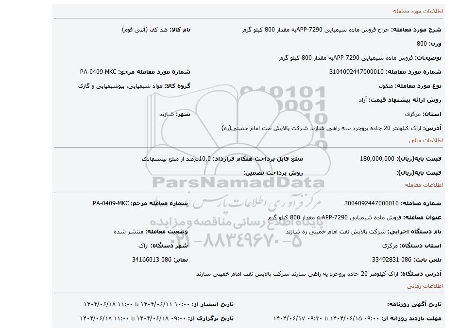 عنوان معامله: فروش ماده شیمیایی APP-7290به مقدار 800 کیلو گرم