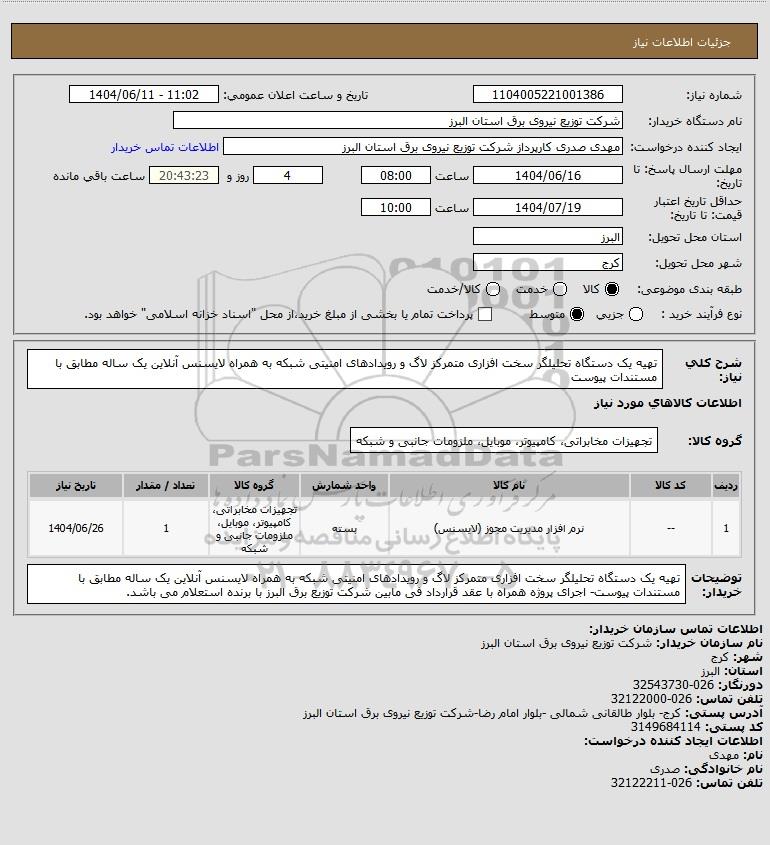 توضیحات خریدار:تهیه یک دستگاه تحلیلگر سخت افزاری متمرکز لاگ و رویدادهای امنیتی شبکه به همراه لایسنس آنلاین یک ساله مطابق با مستندات پیوست- اجرای پروژه همراه با عقد قرارداد فی مابین شرکت توزیع برق البرز با برنده استعلام می باشد.