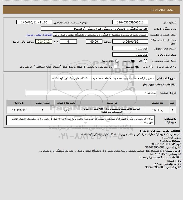 شرح کلی نیاز: تعمیر و ارائه خدمات موتورخانه خوابگاه های دانشجوی دانشگاه علوم پزشکی کرمانشاه
