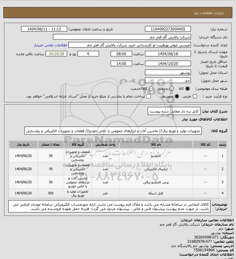 استعلام کابل زره دار مطابق شرح پیوست, استعلام کابل زره دار مطابق شرح پیوست