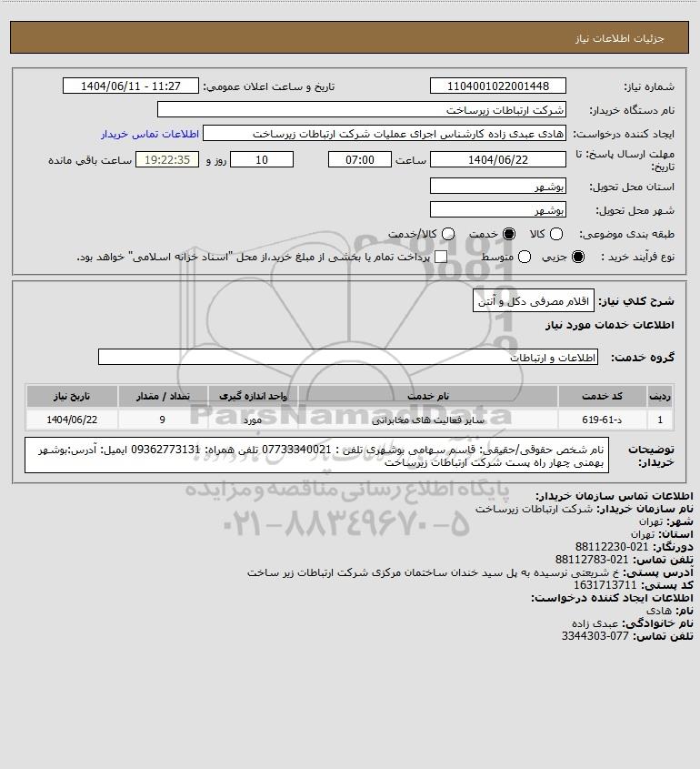 شرح کلی نیاز: اقلام مصرفی دکل و آنتن