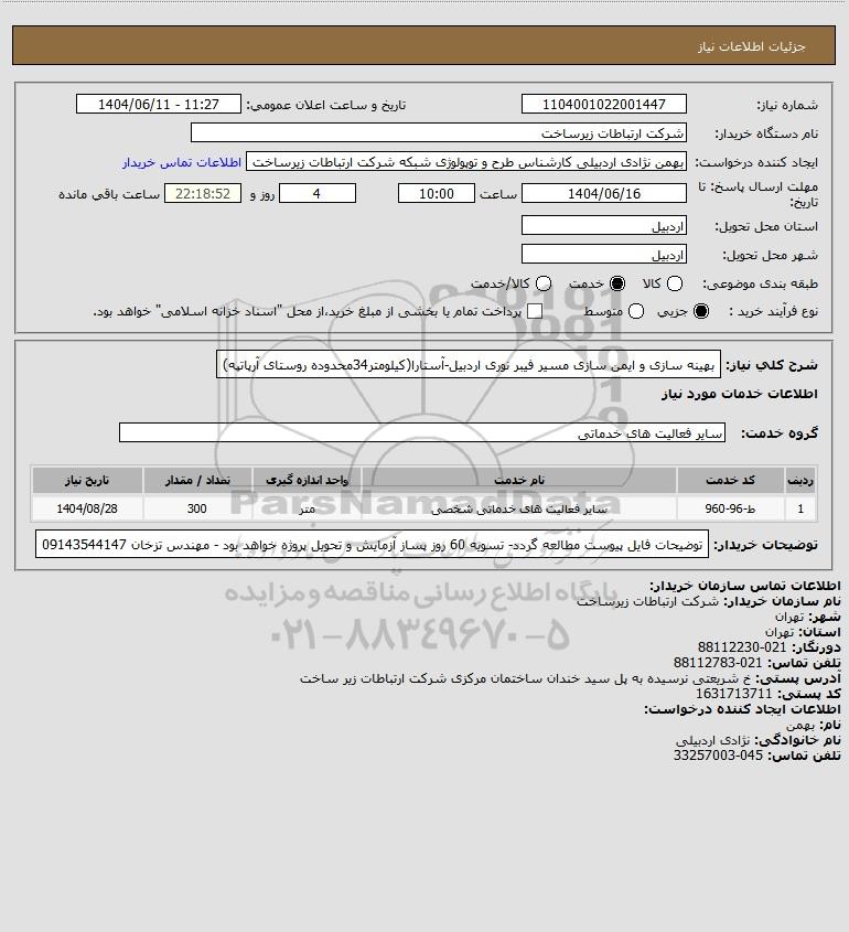 شرح کلی نیاز: بهینه سازی و ایمن سازی مسیر فیبر نوری اردبیل-آستارا(کیلومتر34محدوده روستای آرپاتپه)