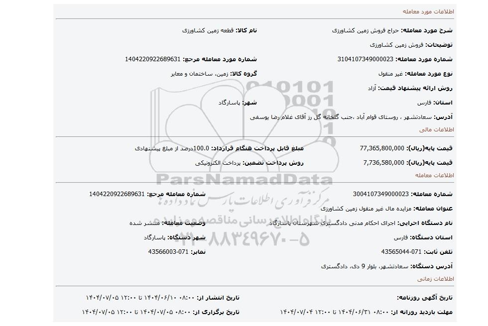 مزایده عمومی مزایده فروش زمین کشاورزی برگزار میگردد. از کلیه افراد متخصص و شرکت‌های واجد شرایط دعوت به عمل می‌آید تا در این مزایده با کد خبرگزاری پارس نماد : 9489051 شرکت نمایند تاریخ شروع مزایده : 1404/06/10 مهلت شرکت در مزایده: تا پایان روز 1404/07/05 مکان برگزاری اموال واگذاری استان‌های فارس و دسته‌بندی‌های مربوط به این حراجی ماشین آلات و تجهیزات کشاورزی و دام پروری, املاک و زمین میباشد. اطلاعات دقیق‌تر درباره شرایط شرکت در مزایده آنلاین و نحوه ارسال مدارک، الزامات پروژه و دریافت اسناد مزایده و تاریخ بازگشایی پاکت‌ها، در بخش اطلاعات تکمیلی این آگهی درج شده است.