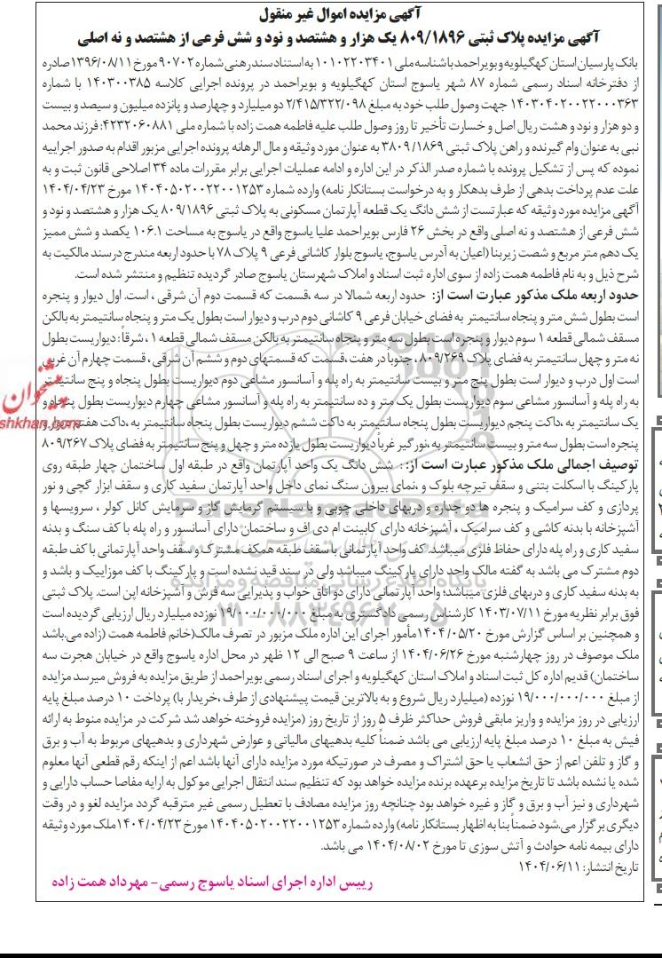 بانک پارسیان استان کهگیلویه و بویراحمد با شناسه ملی 10102203401 به استناد سند رهنی شماره 90702 مورخ 1396.08.11 صادره از دفترخانه اسناد رسمی شماره 87 شهر یاسوج استان کهگیلویه و بویراحمد در پرونده اجرایی کلاسه 140300385 با شماره 140304020022000363