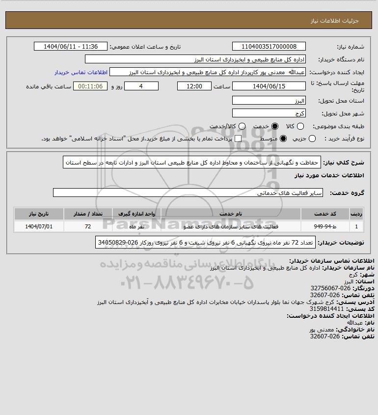 شرح کلی نیاز: حفاظت و نگهبانی از ساختمان و محاوط اداره کل منابع طبیعی استان البرز و ادارات تابعه در سطح استان