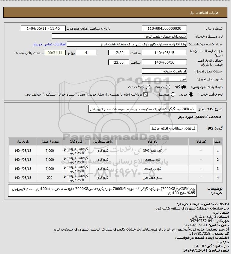 | 3 | -- | کود ریزمغذی | کیلوگرم | گیاهان، حیوانات و اقلام مرتبط | 7,000 | 1404/06/15 |