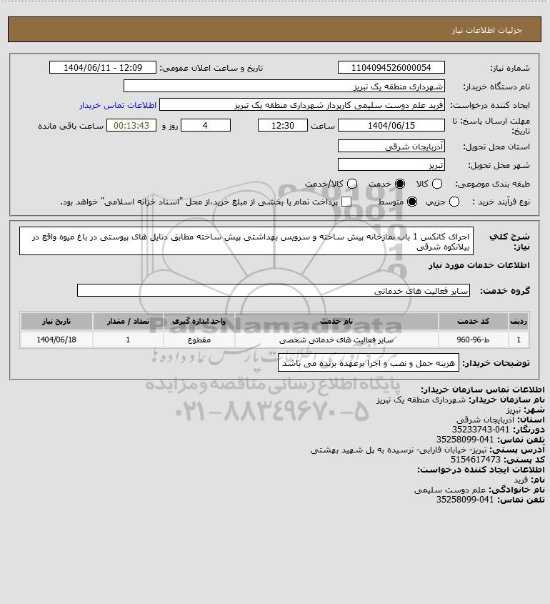 شرح کلی نیاز: اجرای کانکس 1 باب نمازخانه پیش ساخته و سرویس بهداشتی پیش ساخته مطابق دتایل های پیوستی در باغ میوه واقع در بیلانکوه شرقی
