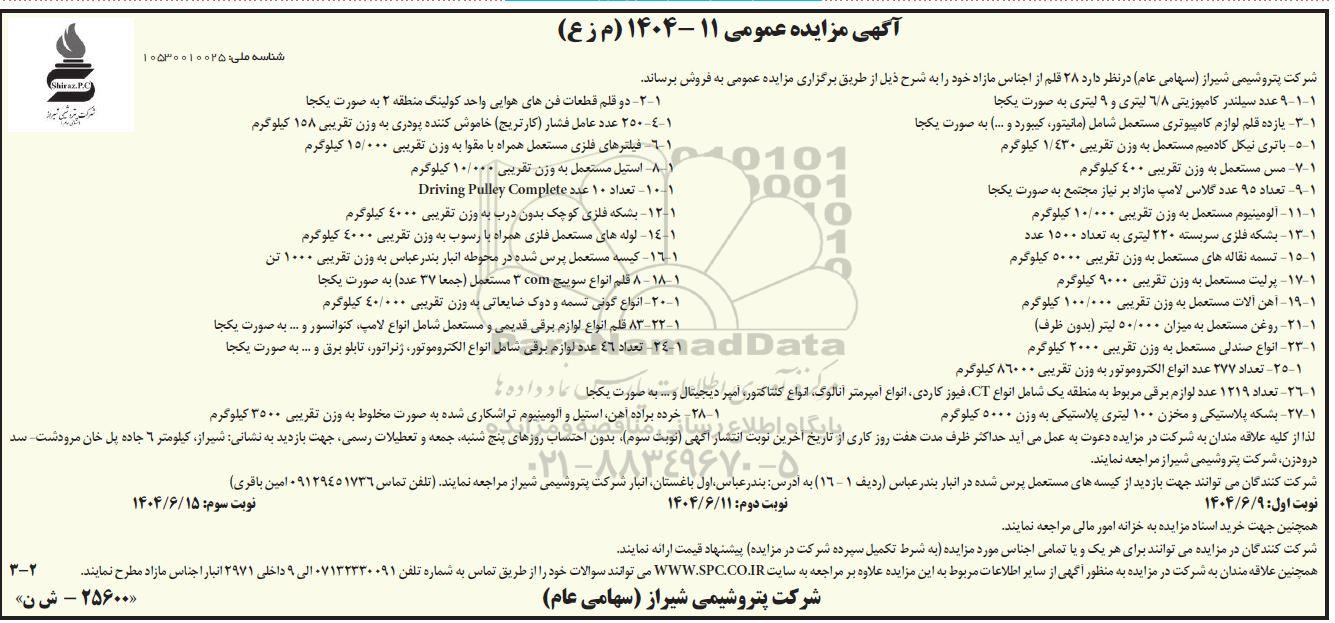 شرکت پتروشیمی شیراز (سهامی عام) درنظر دارد 28 قلم اجناس مازاد بر نیاز خود را از طریق مزایده عمومی مطابق فایل پیوست به فروش برساند.