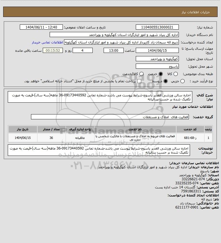 شرح کلی نیاز: اجاره سالن ورزشی الغدیر یاسوج-شرایط پیوست می باشد-شماره تماس 09173440592-36 ماهه(سه سال)-قیمت به صورت تکفیک شده بر حسب سالیانه