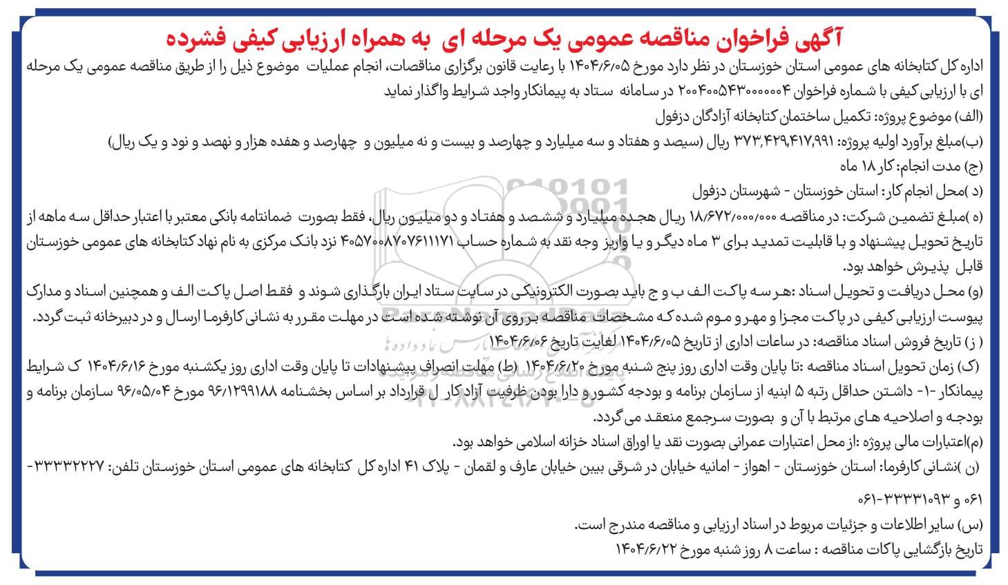 اداره کل کتابخانه های عمومی استان خوزستان در نظر دارد مورخ 1404.6.5 با رعایت قانون برگزاری مناقصات، انجام عملیات موضوع ذیل را از طریق مناقصه عمومی یک مرحله ای با ارزیابی کیفی با شماره فراخوان 2004005430000004 در سامانه ستاد به پیمانکار واجد شرایط واگذار نماید