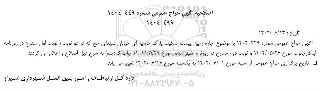 آگهی حراج عمومی شماره 449 - 1404 با موضوع اجاره زمین پیست اسکیت پارک حاشیه ای خیابان شهدای حج که در دو نوبت (نوبت اول مندرج در روزنامه ابتکار جنوب مورخ 1404.05.26 و نوبت دوم مندرج در روزنامه شهر مردم مورخ 1404.05.27 چاپ گردیده) به شرح ذیل اصلاح و اعلام می گردد :