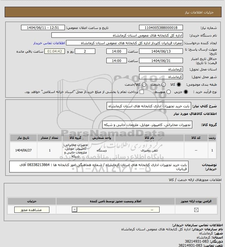 شرح کلی نیاز: بابت خرید تجهیزات اداری کتابخانه های استان کرمانشاه