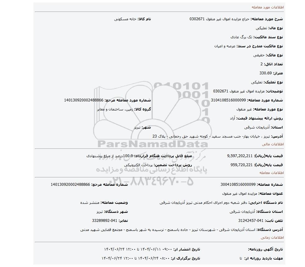 | توضیحات: مزایده اموال غیر منقول 0302671 | ||
