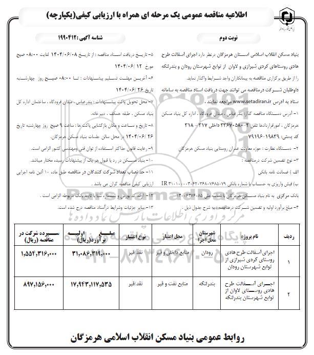 بنیاد مسکن انقلاب اسلامی استان هرمزگان در نظر دارد اجرای آسفالت طرح هادی روستاهای کردی شیرازی و لاوان از توابع شهرستان رودان و بندر لنگه  را از طریق برگزاری مناقصه به پیمانکاران واجد شرایط واگذار نماید. داوطلبان شرکت در مناقصه میتوانند جهت دریافت اسناد مناقصه به سامانه ستاد ایران مراجعه نمایند .