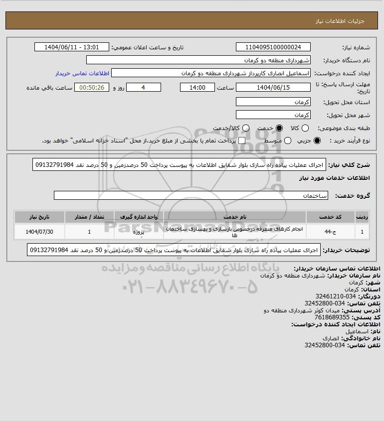 شرح کلی نیاز: اجرای عملیات پیاده راه سازی بلوار شقایق اطلاعات به پیوست پرداخت 50 درصدزمین و 50 درصد نقد 09132791984