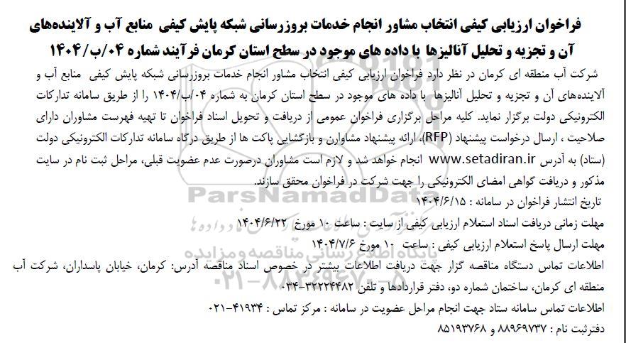 فراخوان ارزیابی کیفی انتخاب مشاور انجام خدمات بروزرسانی شبکه پایش کیفی منابع آب و آلاینده های آن و تجزیه و تحلیل آنالیزها با داده های موجود در سطح استان کرمان فرآیند شماره 04.ب. 1404