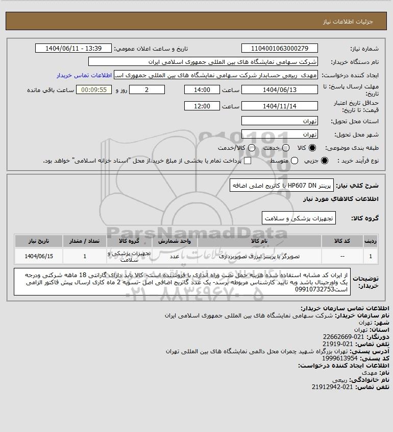شرح کلی نیاز: پرینتر HP607 DN با کاتریج اصلی اضافه