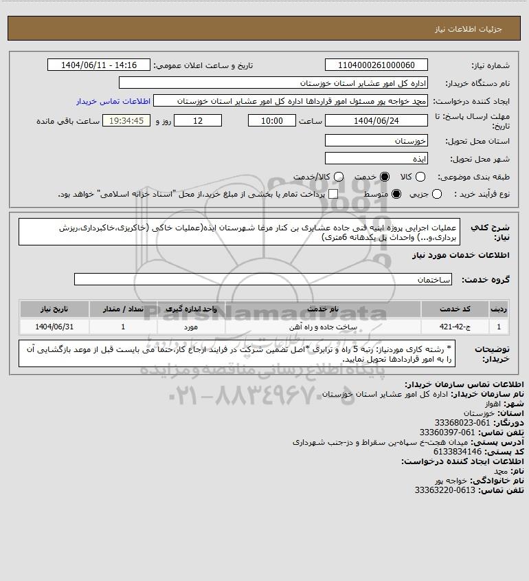 شرح کلی نیاز: عملیات اجرایی پروژه ابنیه فنی جاده عشایری بن کنار مرغا شهرستان ایذه(عملیات خاکی (خاکریزی،خاکبرداری،ریزش برداری،و...) واحداث پل یکدهانه 6متری)