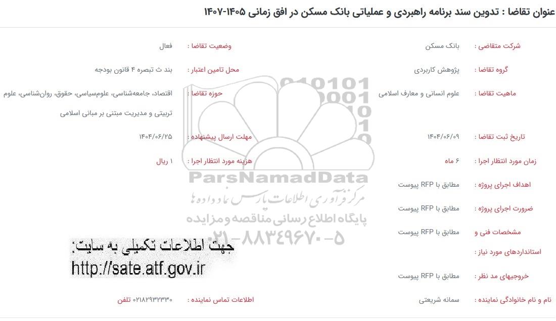 فراخوان تدوین سند برنامه راهبردی و عملیاتی بانک مسکن در افق زمانی 1405-1407 از کلیه افراد متخصص و شرکتها واجد شرایط دعوت به عمل میآید در مناقصه با کد خبرگزاری پارس نماد: 9490696 شرکت نمایند.