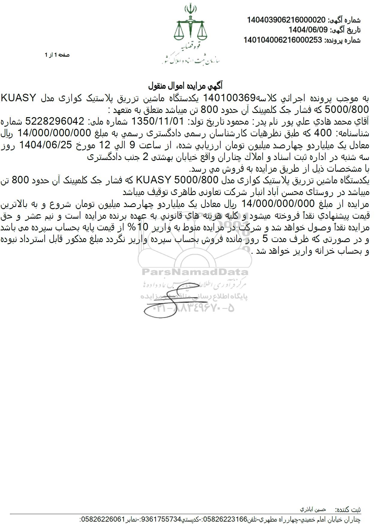 مزایده عمومی مزایده یکدستگاه ماشین تزریق پلاستیک کوازی برگزار میگردد. از کلیه افراد متخصص و شرکت‌های واجد شرایط دعوت به عمل می‌آید تا در این مزایده با کد خبرگزاری پارس نماد : 9490749 شرکت نمایند تاریخ شروع مزایده : 1404/06/11 مهلت شرکت در مزایده: تا پایان روز 1404/06/25 مکان برگزاری اموال واگذاری استان‌های خراسان رضوی و دسته‌بندی‌های مربوط به این حراجی تجهیزات کارخانه ها و ماشین آلات صنعتی میباشد.