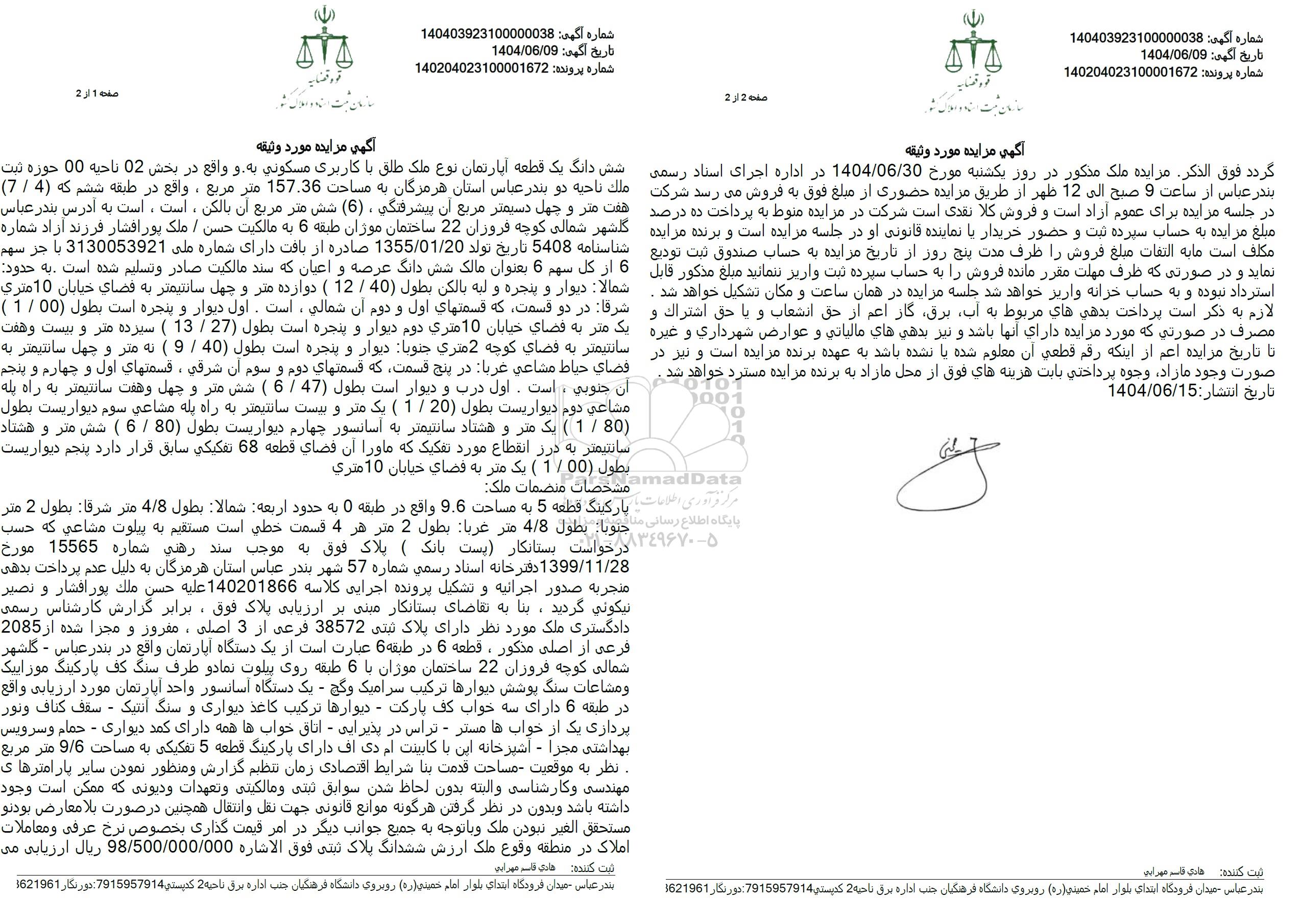 مزایده فروش یک قطعه اپارتمان با کاربری مسکونی به مبلغ 98.500.000.000 ریال