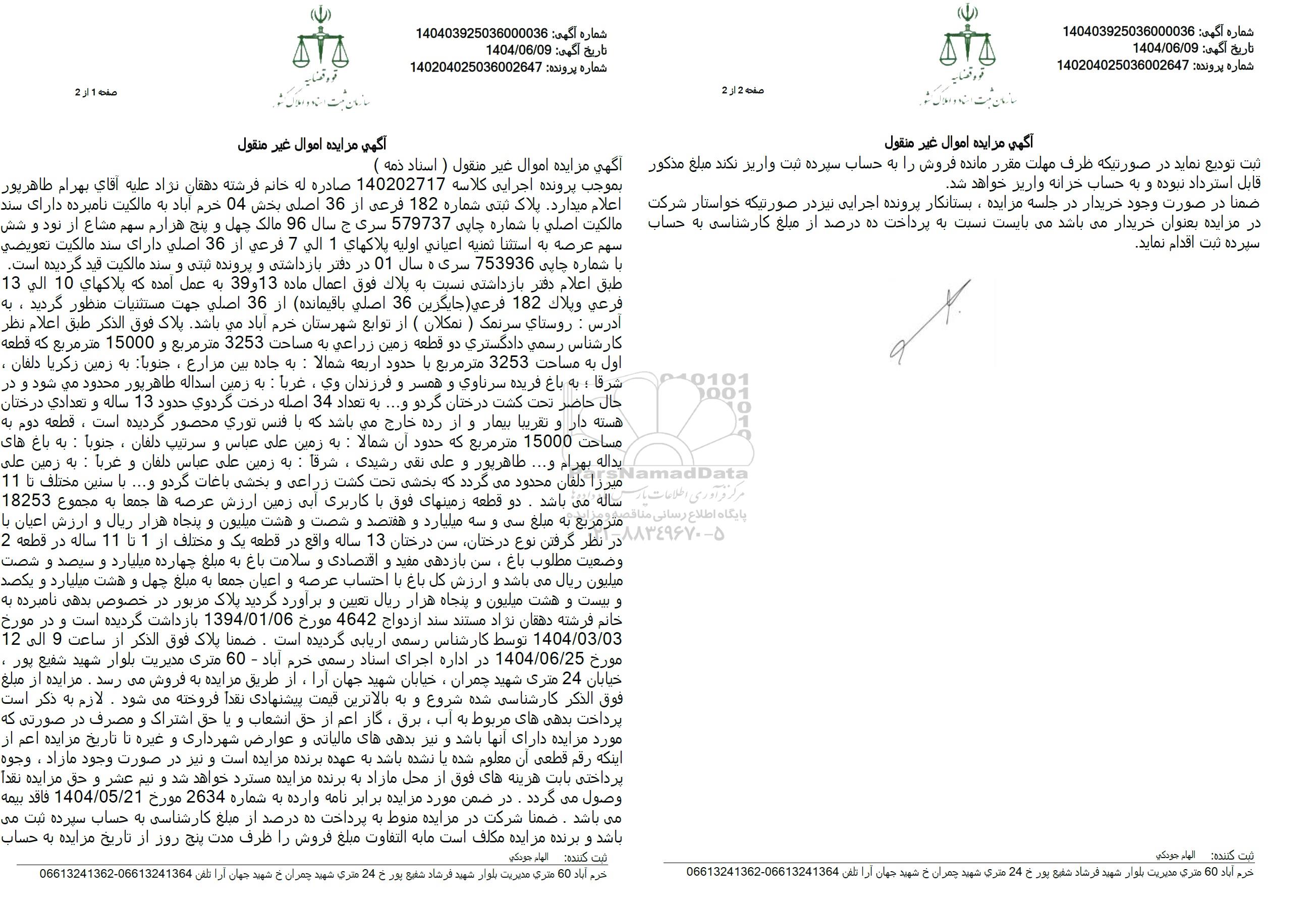 مزایده فروش پلاک ثبتی ش ماره 182 فرعی از 36 اصلی