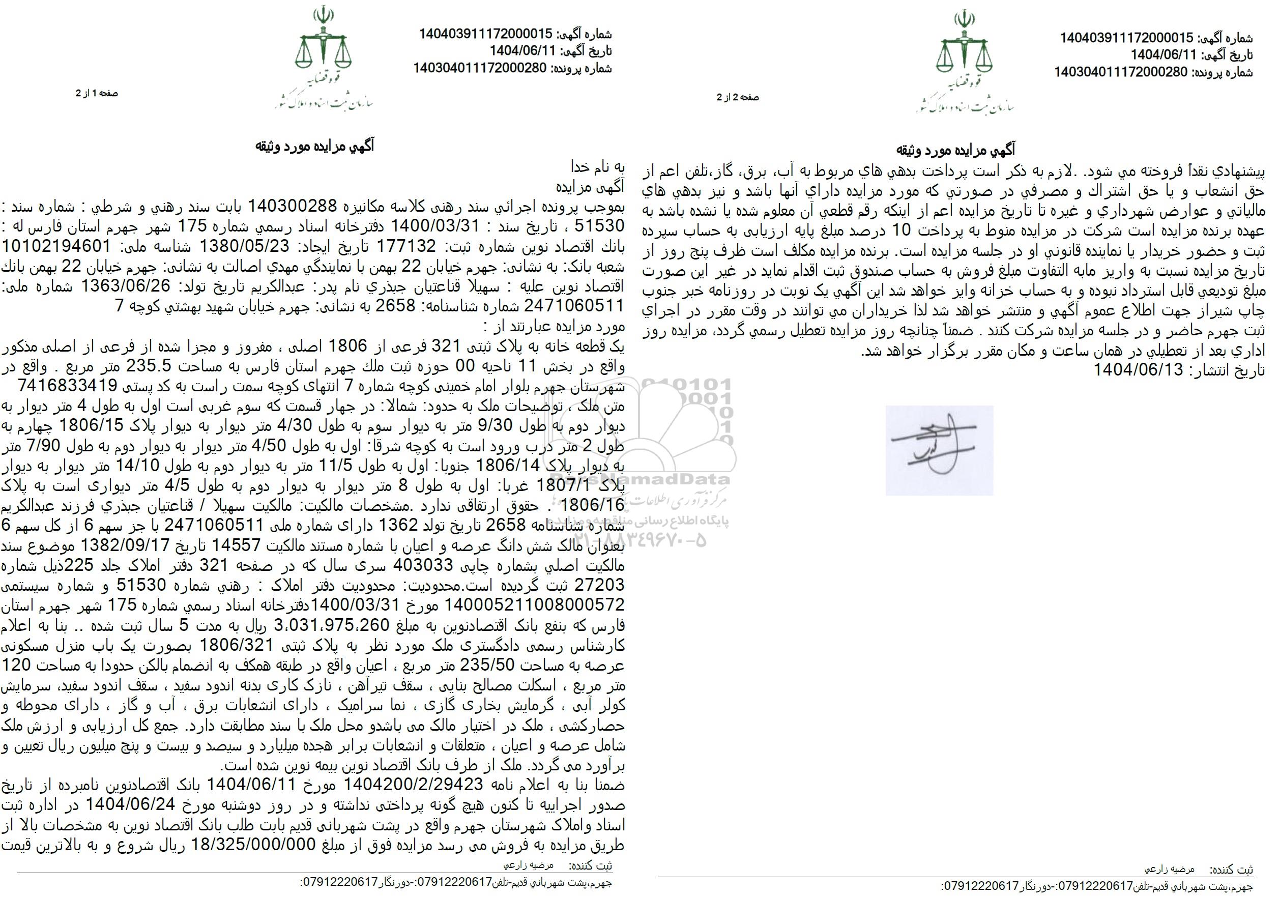 مزایده فروش یک قطعه خانه به پلاک ثبتی 321 فرعی از 1806 اصلی, مزایده فروش یک قطعه خانه به پلاک ثبتی 321 فرعی از 1806 اصلی
