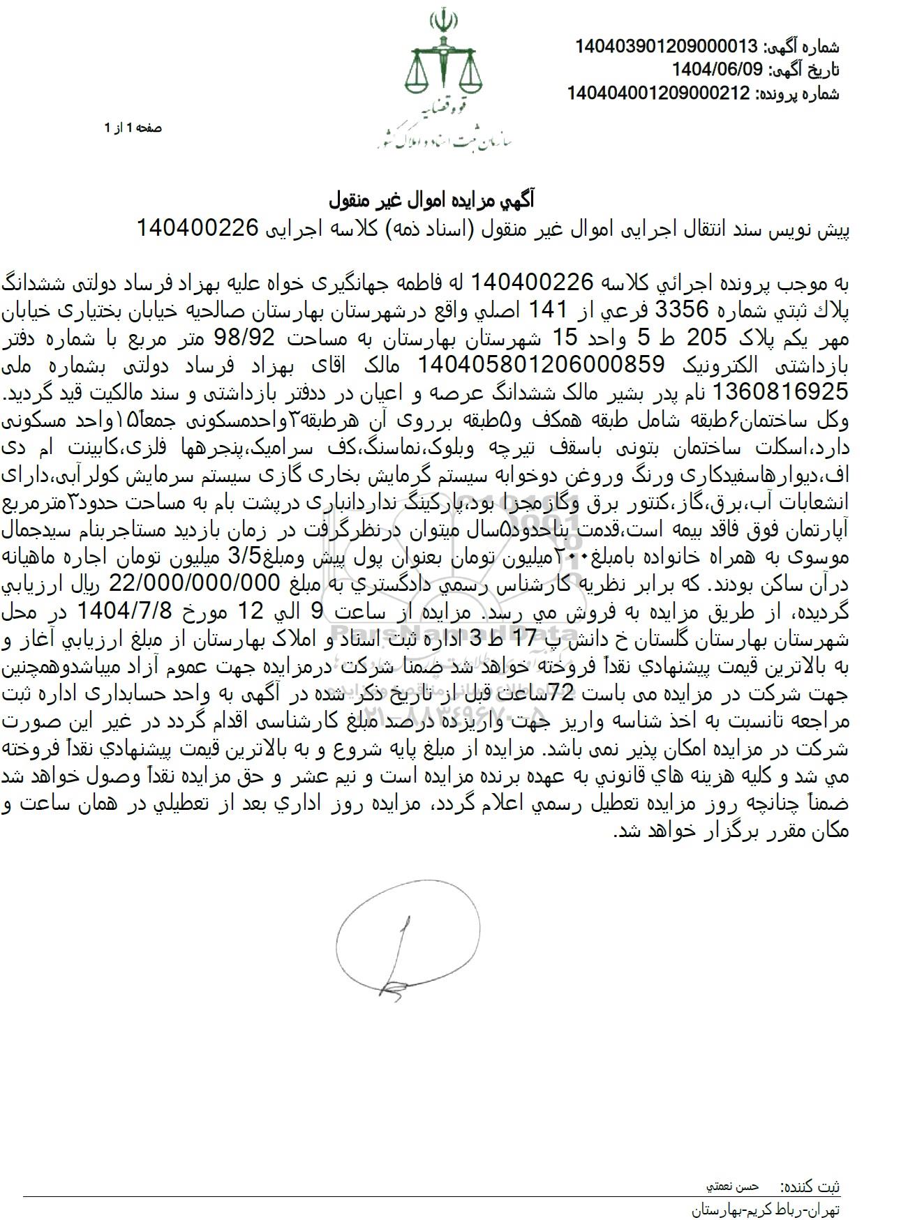 مزایده فروش ششدانگ پلاک ثبتی شماره 3356 فرعی از 141 اصلی